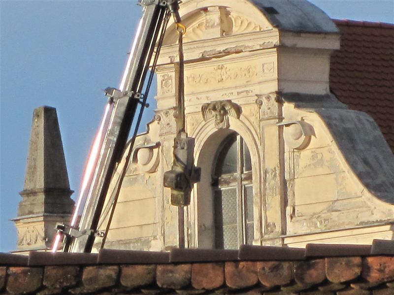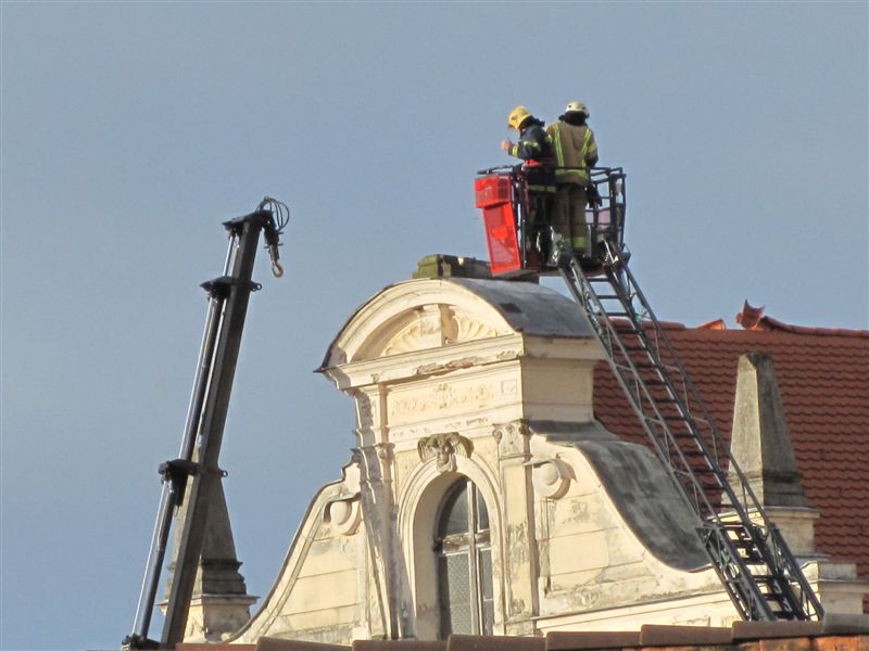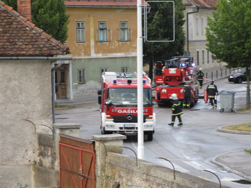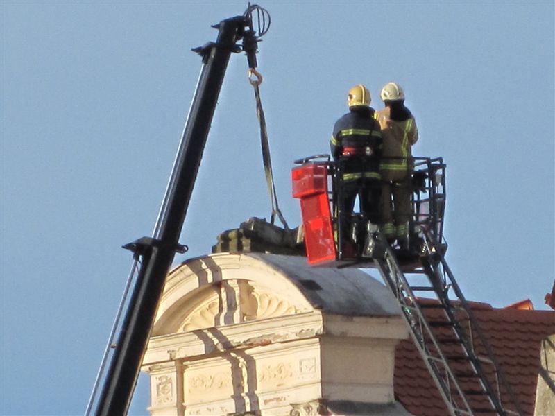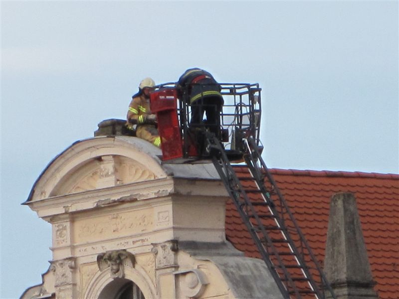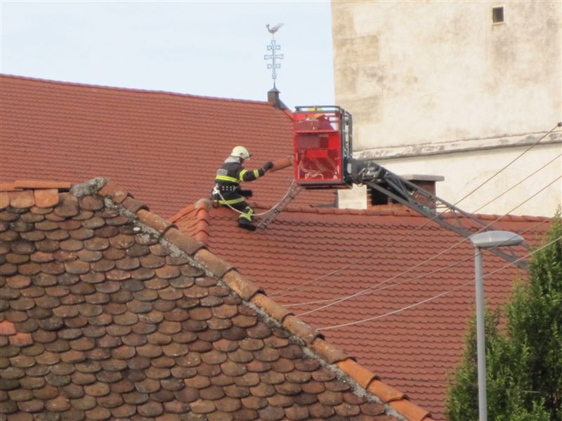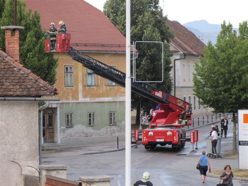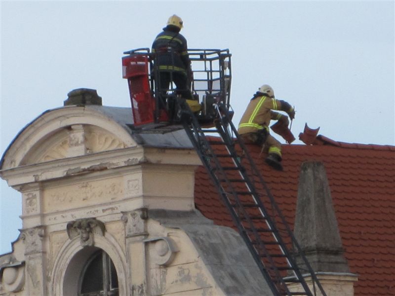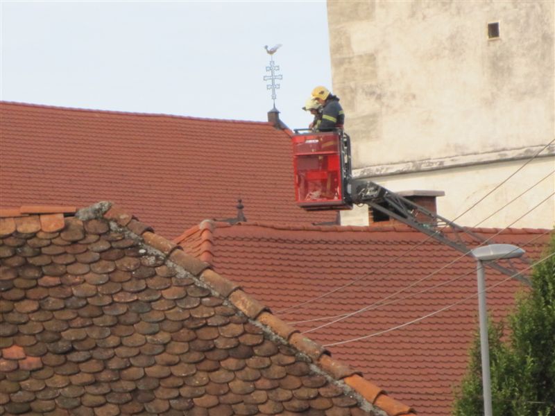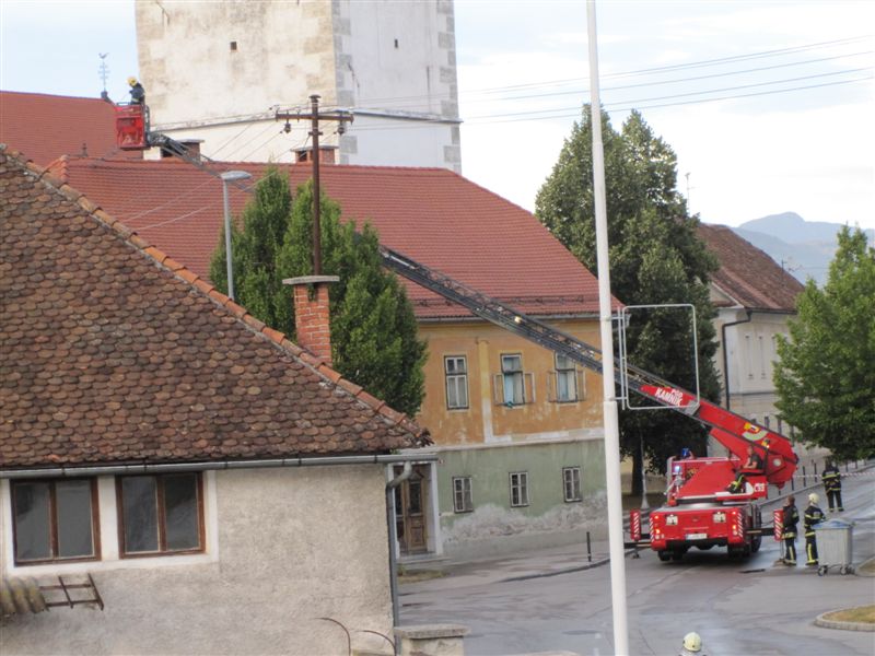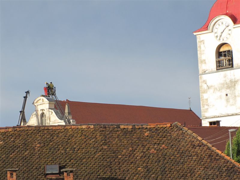 V ponedeljek, 29. julija 2013, v popoldanskem času je zajel Mengeš z okolico močan orkanski veter. Gasilci iz GZ Mengeš so imeli polne roke dela z razkritimi strehami. Po povratku z intervencije na Liparjevi cesti v Mengšu so gasilci iz PGD Topole opazli, da na strehi farne cerkve v Mengšu manjkajo slemenjaki. V intervenciji so bili tudi gasilci PGD Kamnik z dvižno avtomobilsko lestvijo. Takoj je stekla akcija o saniranju strehe. Ko so se dvignili na vrh strehe so opazli, da na slemenu leži prevrnjen masivni kamniti križ, težak okrog 200kg. Za pomoč so zaprosili g. Viktorja Dornika, ki je z avtodvigalom dvignil prevenjeni križ s strehe in ga varno spustil na tla. Rešena je velika nevarnost, kaj bi bilo, če bi križ nepričakovano, čez čas padel na tla, na ljudi. Streha je popravljena, križ pa bodo čez čas namestili nazaj strokovnjaki za tovrstna dela. Z vrha strehe so opazili, da je veter odpihnil tudi slemenjake iz sosedne kaplanije. Tudi tu so namestili nove slemenjake. V akciji so sodelovali gasilci iz PGD Loka, PGD Topole, PGD Kamnik z avto lestvijo in g Viktor Dornik z avtodvigalom. Fotografije pa je prispeval bližnji sosed, ki je od doma posnel te fotografije in jih prinesel v Topole g. Petru Jemec, za kar se mu lepo zahvaljujemo. |