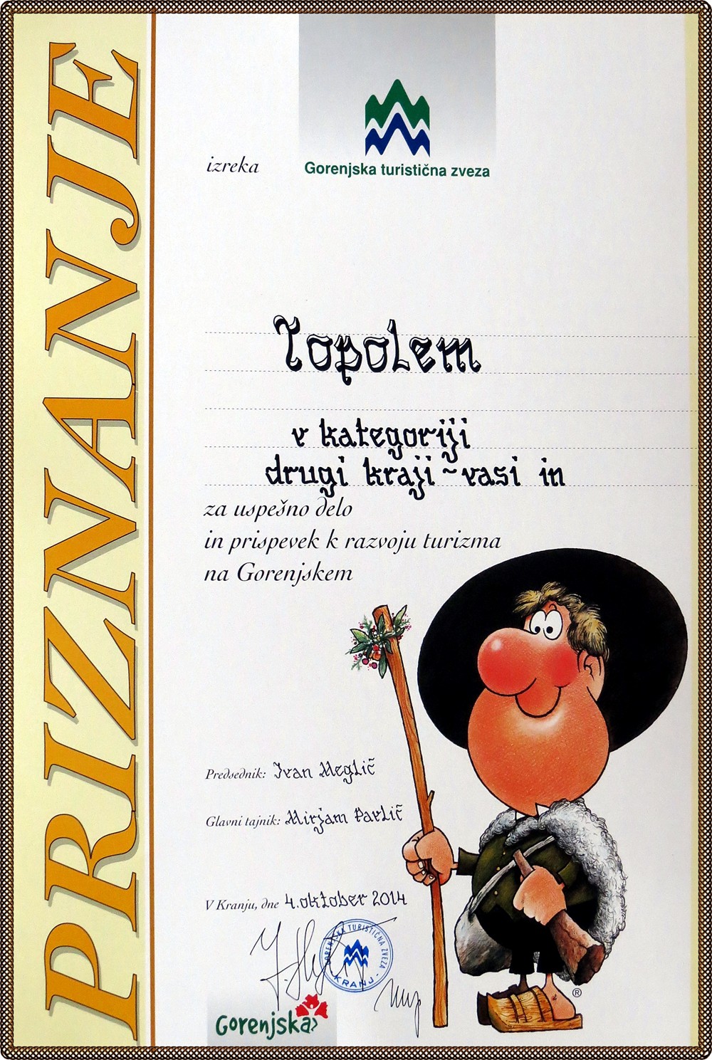 TD Mengeš je v začetku letošnjega leta na razpisu Moja dežela lepa in gostoljubna v kategorijo manjši kraji in vasi prijavilo tudi vas TOPOLE. Prijetno smo bili presenečeni, da so bile v tej akciji Topole izbrane kot ena izmed najlepših vasi v svoji kategoriji in so zato dobile priznanje za uspešno delo in prispevek k razvoju turizma na Gorenjskem.