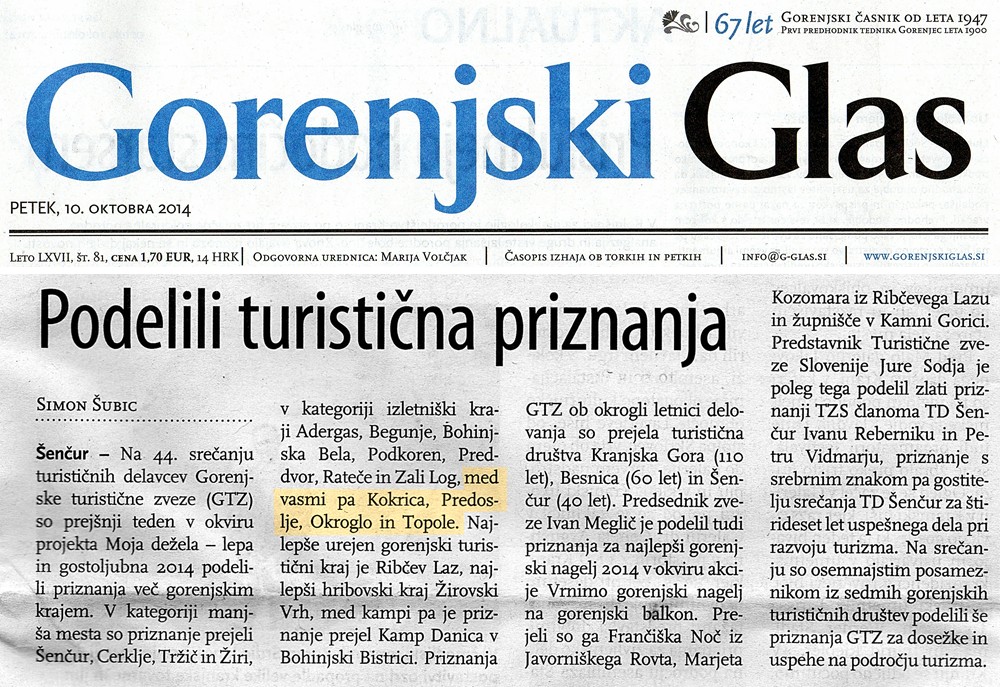 S tem priznanjem se je razširila prepoznavnost naše vasi in tudi mengeške občine po Gorenjskem, saj so bili na srečanju predstavniki krajev in turistični delavci z vse Gorenjske. Geslo Gorenjske turistične zveze »Gorenjska – Skrivnostna in lepa« se je tako ponovno potrdilo. Priznanje je prevzel predsednik vaškega odbora Peter Jemec.