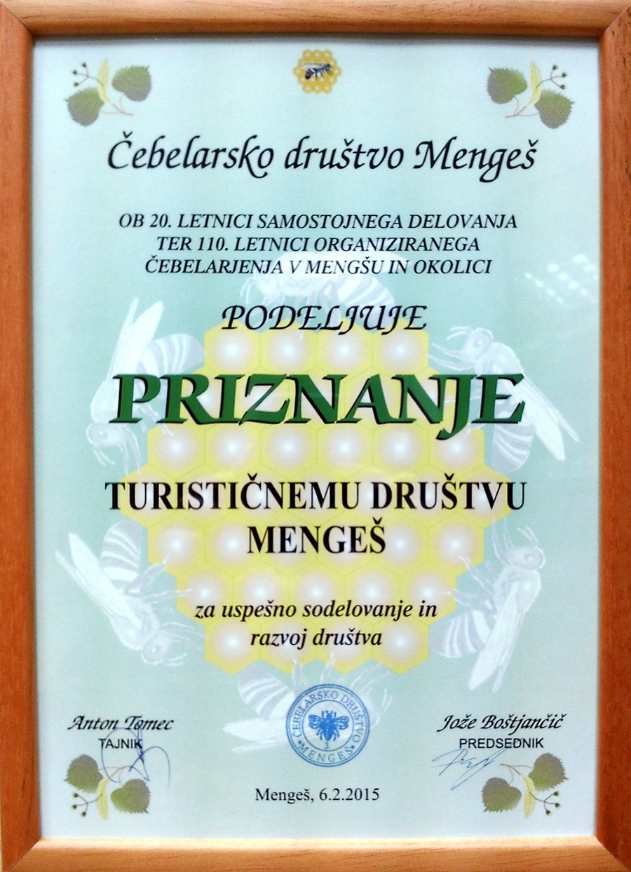 Čebelarako društvo Mengeš je ob 20. letnici samostojnega delovanja ter ob 110. letnici organiziranega čebelarjenja v Mengšu in okolici, dne 20. 2. 2015, na svojem rednem letnem občnem zboru, podelilo Turističnem društvu Mengeš PRIZNANJE za uspešno sodelovanje in razvoj društva. |