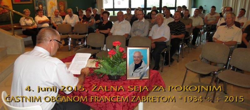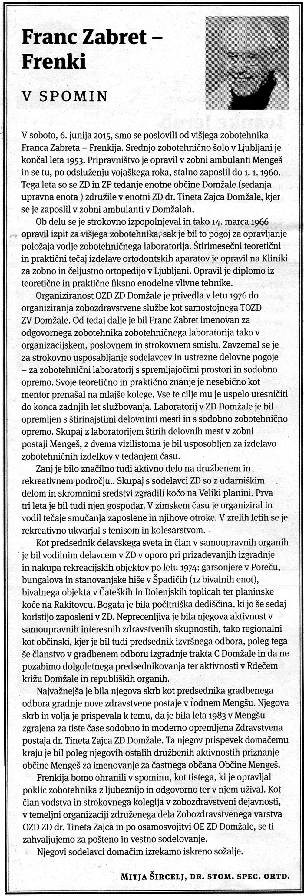 Franc Zbret se je rodil 4. septembra 1934-tega leta v Že takoj po šolanju je začel delovati kot blagajnik Rdečega križa v Mengšu. Vključil se je v delo Planinskega društva kot prvi načelnik mladinskega odseka. Leta 1970 je postal prvi predsednik na novo ustanovljenega Smučarskega društva Mengeš in je v njem deloval preko 12 let. Na področju humanitarnih organizacij, predvsem Rdečem križu, je bil 20 let predsednik območne organizacije, ki je pokrivala območje: Domžal, Mengša, Trzina, Lukavice in Moravč. Več kot 20 let je bil predsednik Turističnega društva Mengeš. V tem obdobju so vsi skupaj skušali čim več postoriti za lepši izgled Občine Mengeš. Izdali so vrsto publikacij, bili organizatorji in soorganizatorji raznih prireditev. Uspešno so predstavljali Občino Mengeš po Sloveniji in zunaj njenih meja. Deloval je na področju tako imenovane podjetne regije za turizem osmih sosednjih občin. Franc Zabret je poleg naštetega že več kot 30 let deloval v Teniški sekciji, še prej pod okriljem Športnega društva Partizan, zadnja leta pa v okrilju samostojnega Teniškega kluba. Tudi v Kolesarskem društvu je bil dejaven več kot 30 let. Kot član Kulturnega društva Mihaelov sejem pa je vsa leta sodeloval pri organizaciji te odmevne in pomembne prireditve. Leta 2004 je dobil najvišje priznanje - Častni občan Občine Mengeš. S svojim delom, zagnanostjo, prijazno besedo je bil vzor vsem nam, ki smo imeli možnosti ali željo z njim sodelovati, ustvarjati, se velikokrat tudi poveseliti, oziroma z njim preživljati lepe trenutke. Veliko je bilo postorjenega kar danes nebo omenjeno, pa vendar tisti, ki smo z njim ožje sodelovali na različnih področjih, bi imeli o tem še veliko povedati. Kljub njegovi volji do življenja je neka tiha in nam nepoznana sila premagala življensko pot častnega občana Franca Zabreta, ki se je žal končala v sredo, 3. junija v zgodnjih jutranjih urah. V tem trenutku želim izreči sožalje njegovi družini, svojcem in vsem tistim, ki ste ga imeli iskreno radi. župan - Franc Jerič |