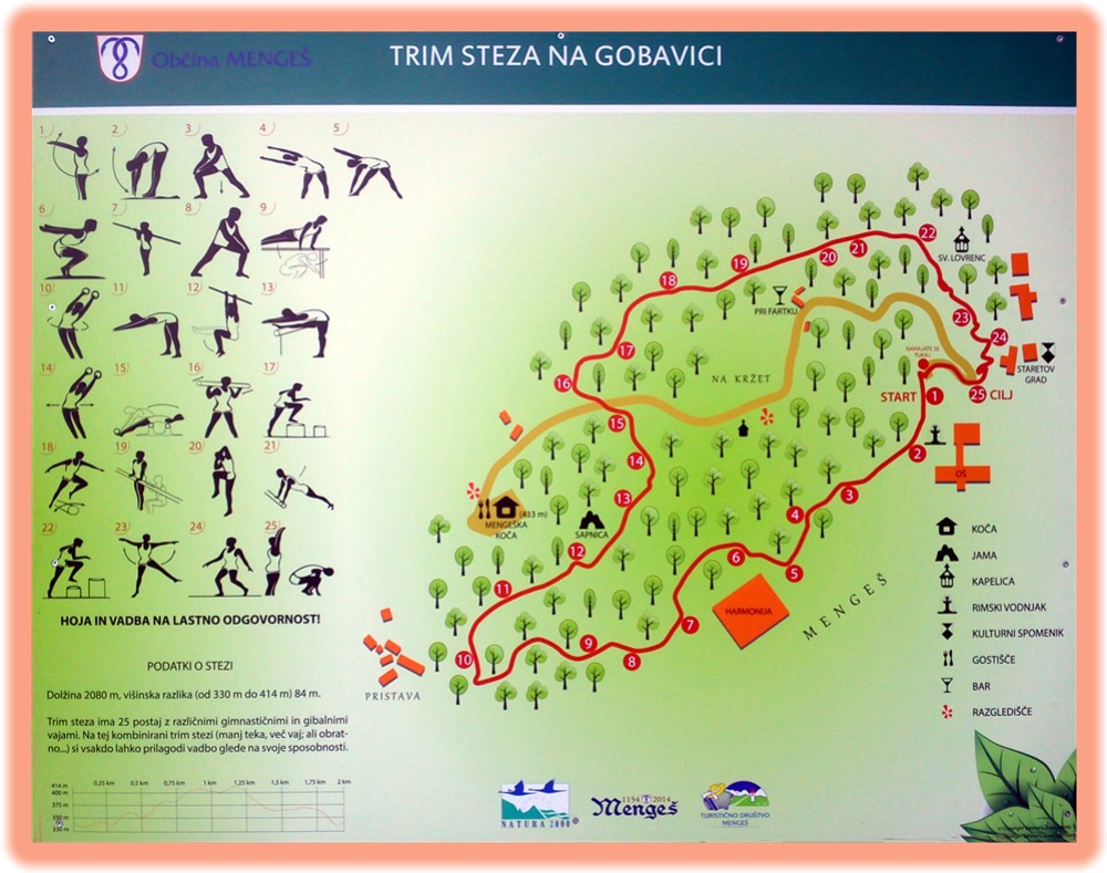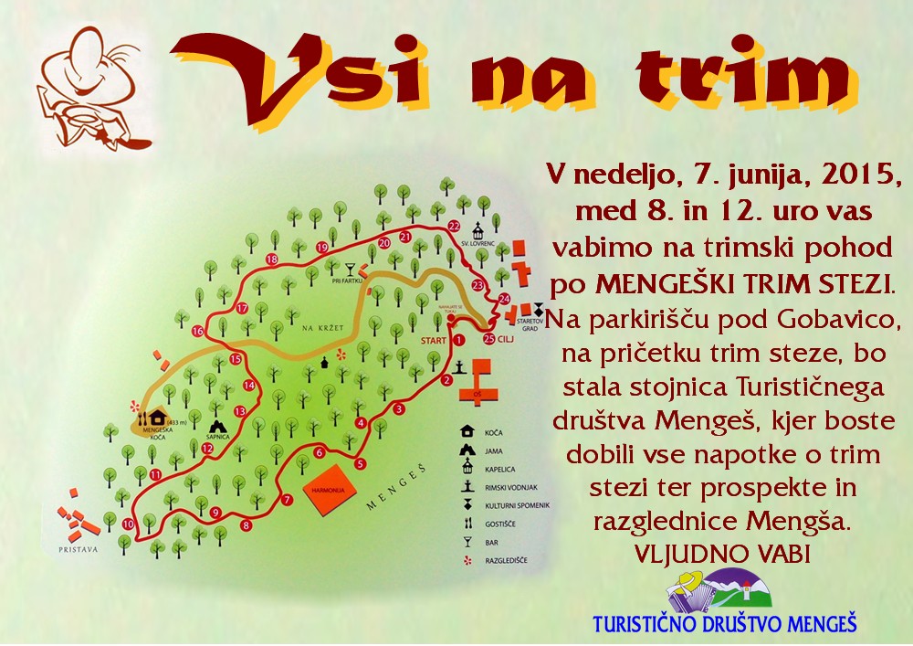 Turistično društvo Mengeš je ob občinskem prazniku Občine Mengeš v nedeljo, 7. junija 2015, med Članice in člani UO našega društva, ki je zadolženo tudi za vzdrževanje vadbenih orodij in urejenost trim steze, smo pred vstopom na stezo postavili informacijsko postajo z namenom, da ugotovimo, kako obiskana je naša trim steza na Gobavici in kako so z njeno urejenostjo zadovoljni uporabniki. Povedati moram, da smo bili z obiskom zadovoljni, saj je v tem kratkem času trim stezo prehodilo ali preteklo in obiskalo še Mengeško kočo ali lokal Pr' Fartku 391 obiskovalcev. Nekateri so trim stezo preteklo dvakrat ali celo trikrat in na posameznih postajah opravili tudi vse predpisane vaje. Z urejenostjo trim steze so bili obiskovalci zadovoljni. Moti pa jih sam dostop do trima, neurejeno grajsko dvorišče in živali, predvsem koze, ki ležijo ali se sprehajajo po cesti in tam puščajo tudi iztrebke.