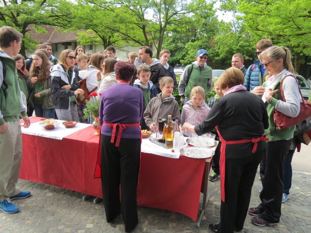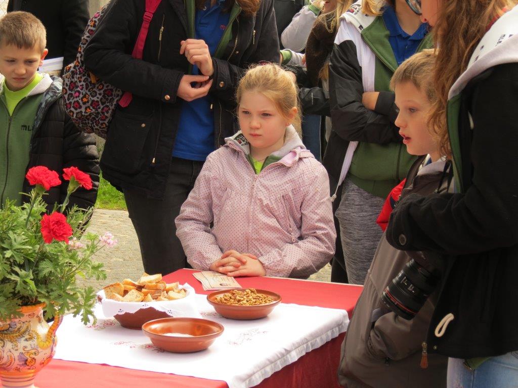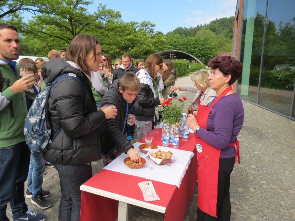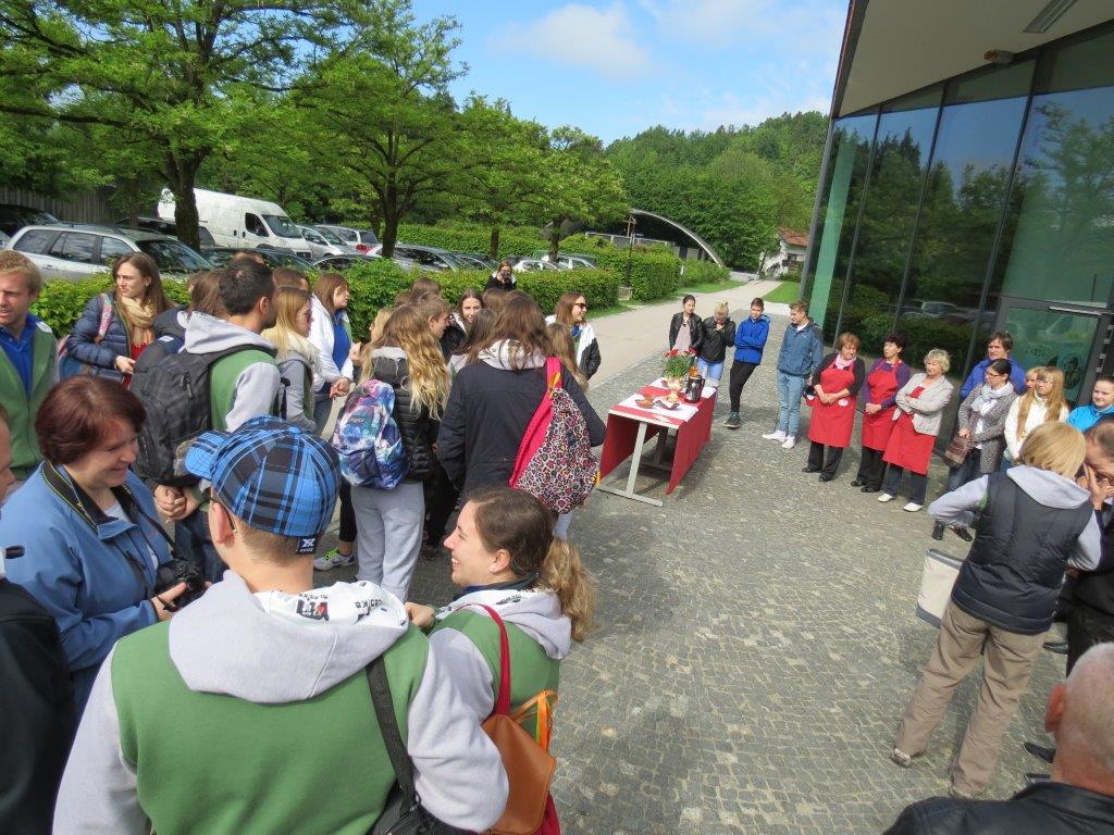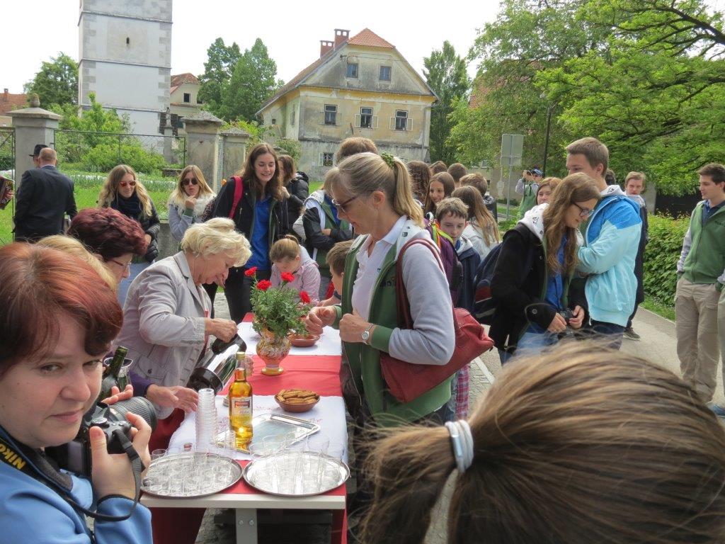 Čanice Turističnega društva Mengeš, pod vodstvom predsednice Zorke Požar, so jim pripravile tradicionalni slovenski prigrizek: kruh in sol, orehova jedrca, piškote in šilce žganja ali medice, za napitek mlajših gostov pa čaj. Vsakemu so izročile tudi ovojnico s prospekti iz Mengša.