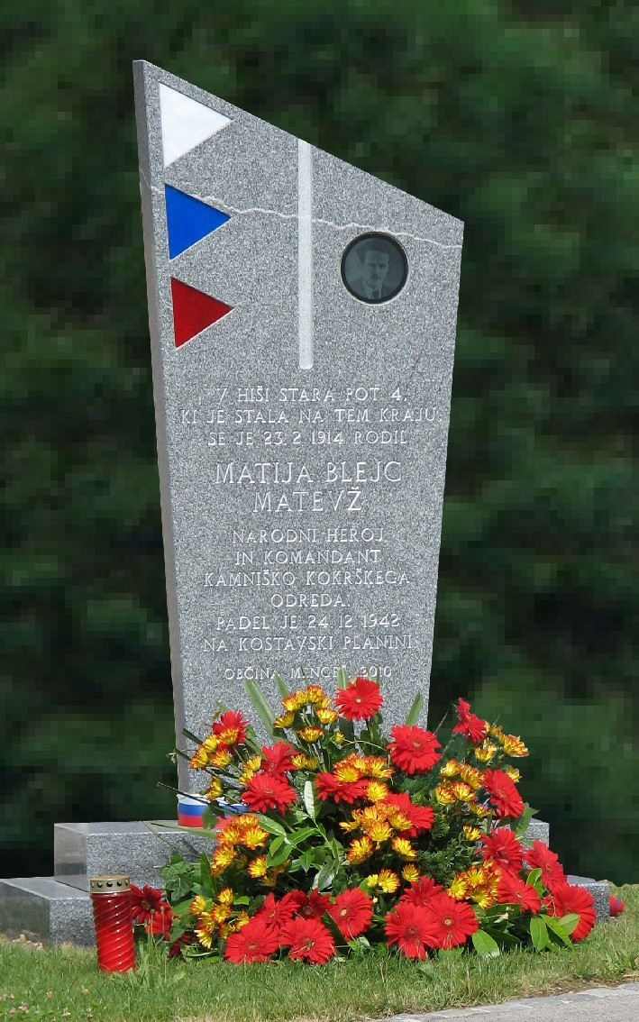 20.06.2010 16. junija 2010, ob 19 uri so v Mengšu, ob stari poti 4 odkrili prenovljen spomenik narodnemu herojuMatiji Blejcu Matevžu. Spomenik stoji na mestu kjer je nekdaj stala rojstna hiša Matija Blejca. Deli :