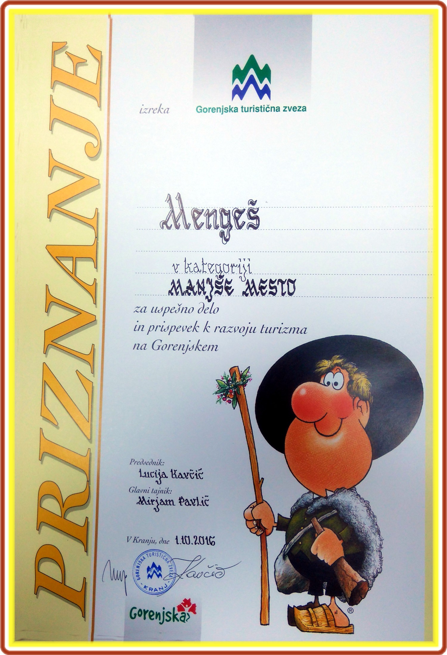 Na 46. srečanju turističnih delavcev v Bohinjski Bistrici, dne, 1. 10. 2016, v dvorani Danica, smo Mengšani prejeli priznanje, v kategoriji manjše mesto, za uspešno delo in prispevek k razvoju turizma na Gorenjskem. Priznaje je prevzel požupan Občine Mengeš g. Bogo Ropotar.
