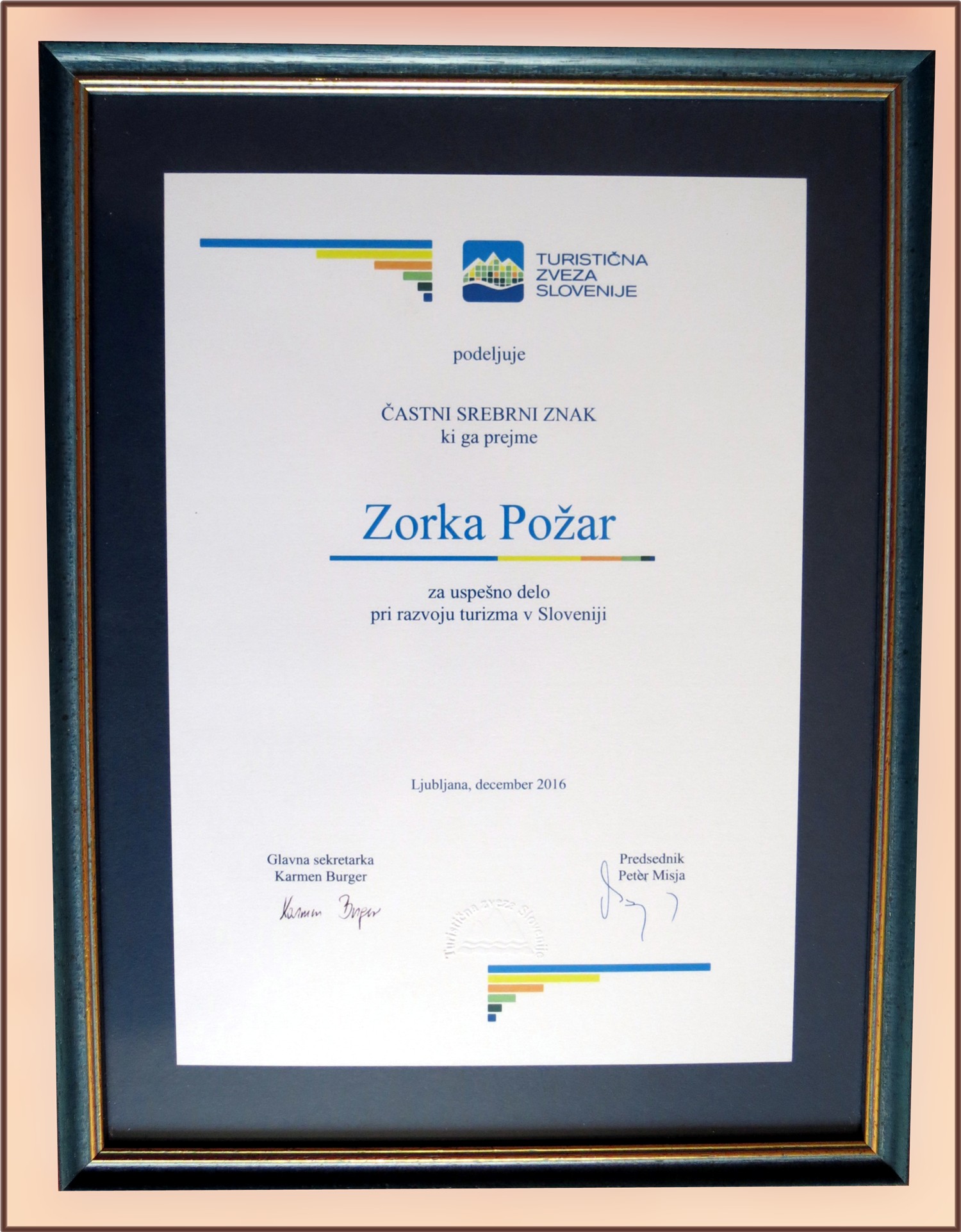 Na Božično-novoletnem koncertu Mengeške godbe, dne 26. 12. 2016, v Kulturnem domu Mengeš, je župan Občine Mengeš, g. Franc Jerič, slovesno izročil srebrno priznanje predsednici Turističnega društva Mengeš gospe Zorki Požar.