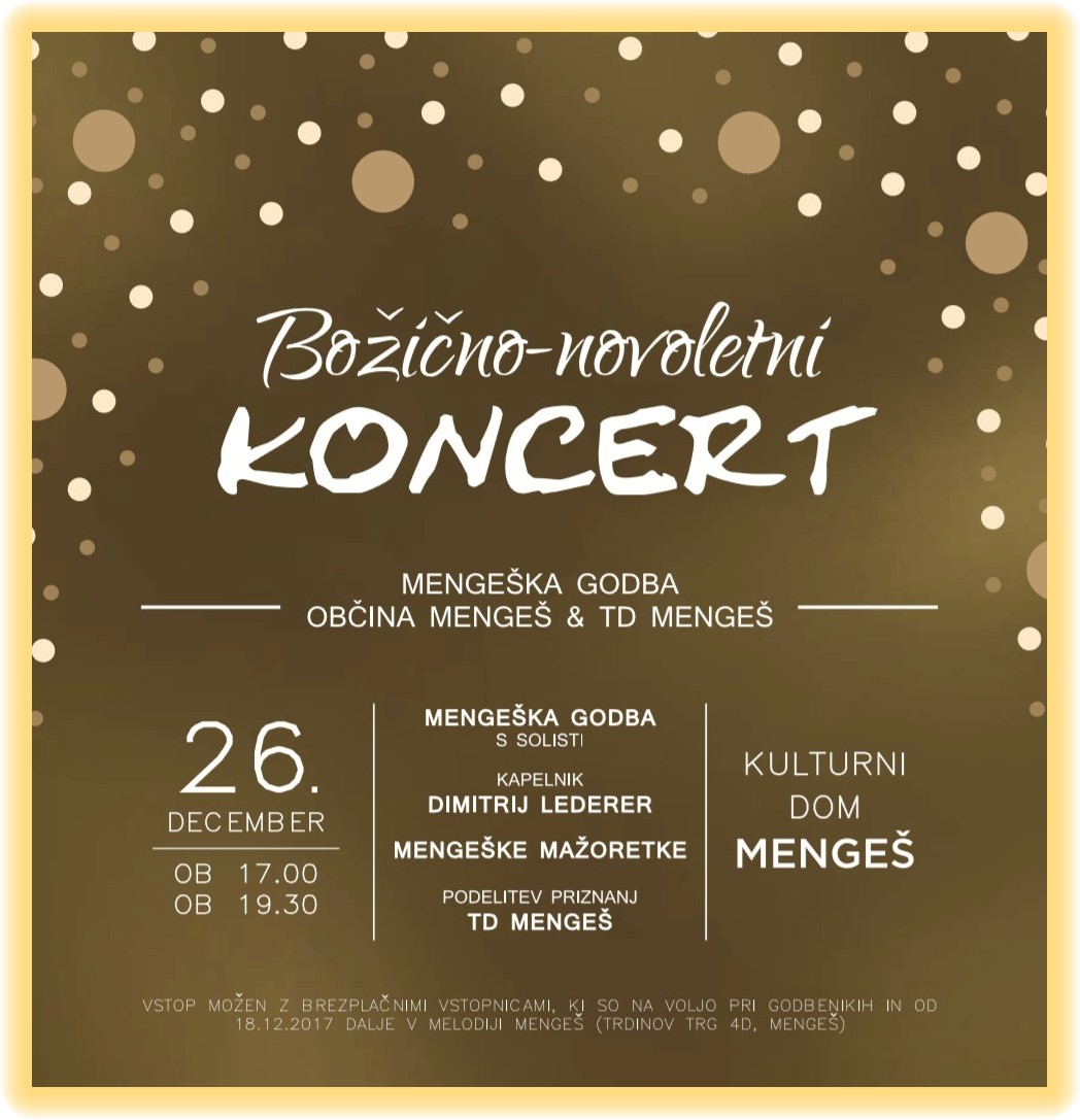 Koncerta bosta tradicionalno v torek, 26. 12. 2017 ob 17. uri in 19.30 uri. Popoldanski, nekoliko krajši koncert, je primeren tudi za mlade družine, na večernem koncertu pa bomo obeležili še državni praznik dan samostojnosti in enotnosti, Turistično društvo Mengeš pa bo podelilo priznanja izbranim občanom za lepo urejene domove z okolico.