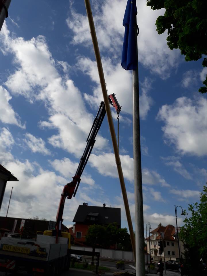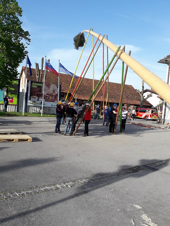 Tradicija je , da se za prvomajske praznike v Mengšu postavi mogočen mlaj na star način. S pomočjo pikov, laten in močnih rok. Tudi letos smo se gasilci lotile tega izziva.Mlaj je bil dolg 40 metrov. Česar smo se najbolj bali se je zgodilo. Na polovici dela , ko je bil mlaj z vrhom oddaljen od tal cca 25m, se je odlomil vrh. Hvala Bogu nihče ni bil poškodovan, saj delo opravljamo odgovorno. Ker poti nazaj ni bilo smo mlaj brez vrha postavili do konca. za postavitev mlaja smo potrebovali kar dobri dve uri in pol. Danes smo se lotili popravila na sodoben način. Avtodvigalo je izruvalo mlaj in deblo položilo na tla, dodali smo nov vrh, malo manjši in mlaj postavili na na njegovo mesto. Spreten operater je to opravil v treh minutah. Še pritrditev zastave, pogled proti nebu in prazniki se lahko pričenjajo.
