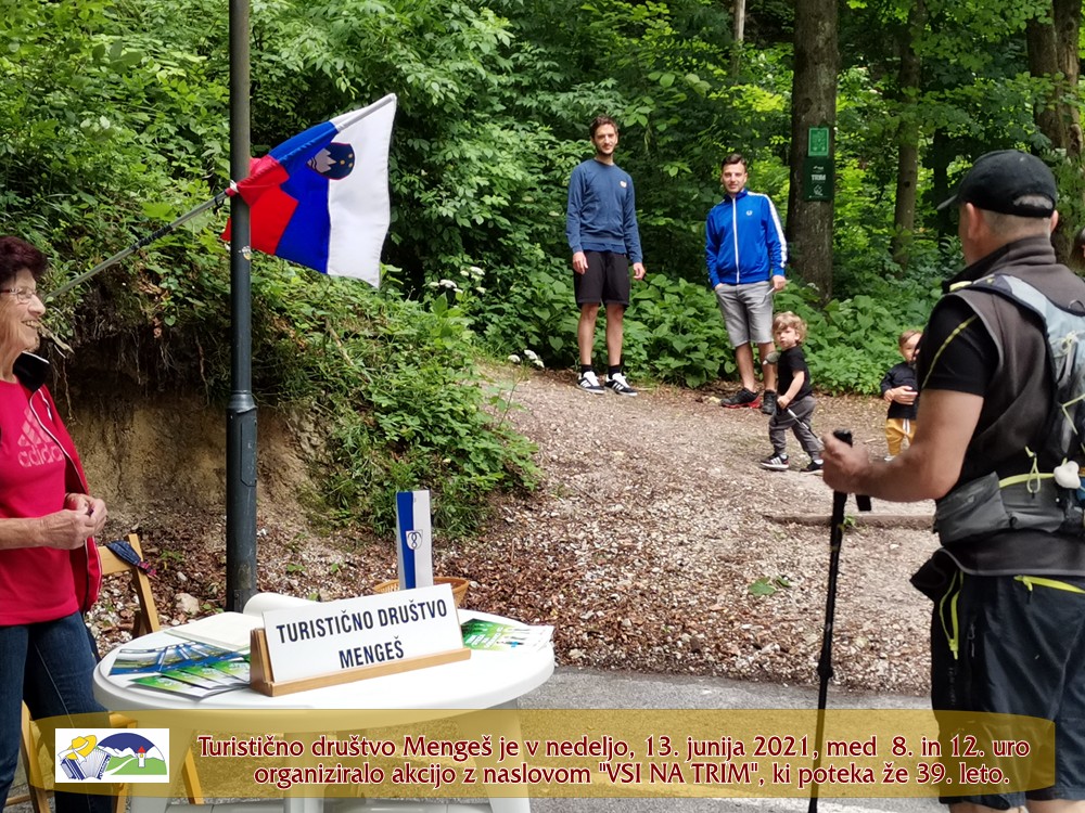 Turistično društvo Mengeš je v nedeljo, 13. junija 2021, med 8. in 12. uro organiziralo akcijo z naslovom » VSI NA TRIM » , ki poteka že 39.leto.