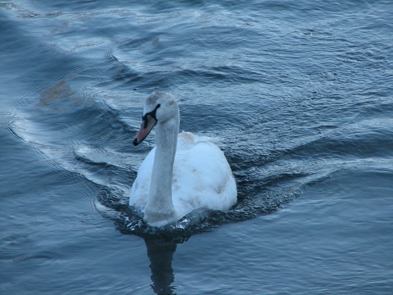 Od kod je prišel nihče ne ve. Obročka na nogi tudi nima. Prav nič ga ne moti led ob robovih struge Pšate. Ljudi se ne boji. Ko zagleda na mostu osebo se obrne proti njej in pohlevno čaka na hrano. Z veseljem lovi na vodni gladini majhne koščke kruha in jih poje.