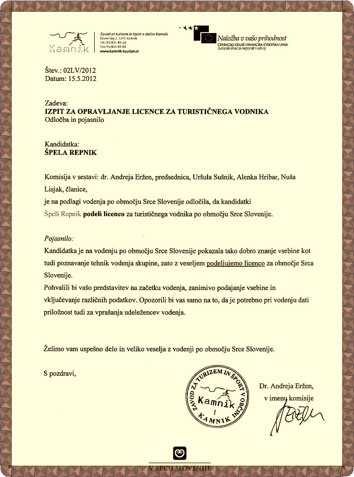 Naša članica gdč. ŠPELA REPNIK je 15. maja 2012 uspešno opravila izpit za turistično vodnico in s tem pridobilas licenco za turistično vodnico po območju Srce Slovenije.